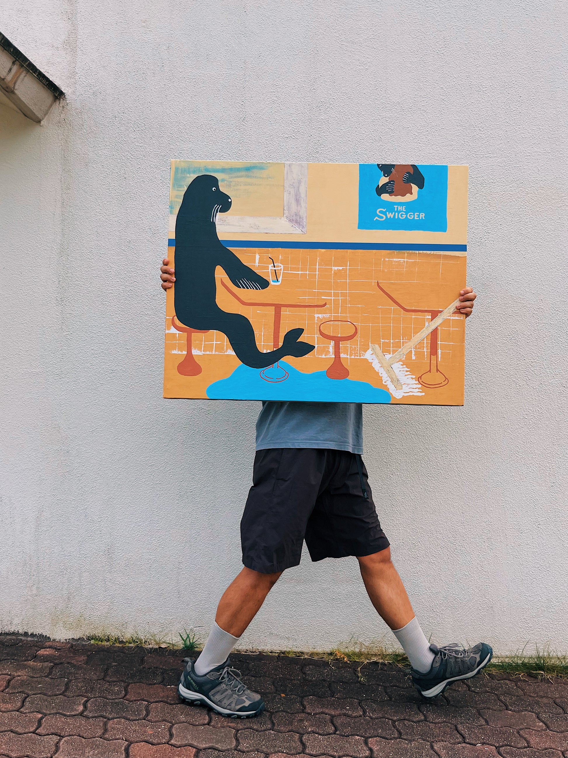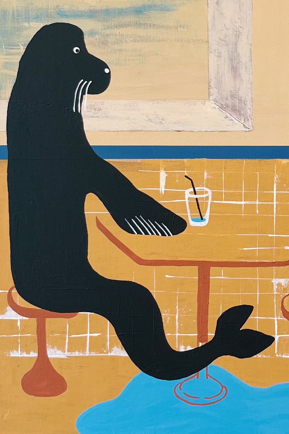 From the sea to the aquarium, and eventually to a movie star. This is a painting of a sea lion who quietly dreams of success in human society, waiting for someone at a cafe. (Probably the person he is waiting for will never show up.)