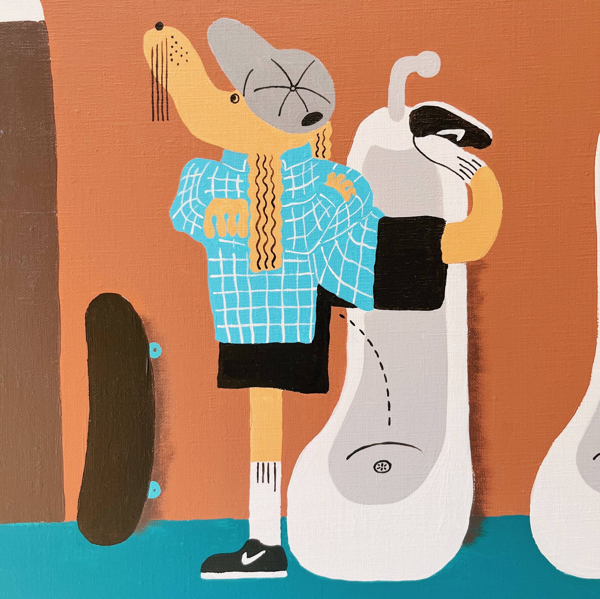 街を生きる犬の主人公スリッピーを描いた4部作「SLIPPIE DON'T SKATE」の一作目は、彼がクラブのような場所でガールハントを試みる作品 ”It's three a.m.”(午前3時)で始まります。「片足を上げて用を足す犬が擬人化したら、男子トイレでどんな体勢になるだろう」というたわいもない想像からこの絵を描き始めました。SLIPPIEという名前は「slip(滑る、つまづく、しくじる)」の単語から来ていて、街の中でいつもしくじってしまう人物をイメージして描いています。