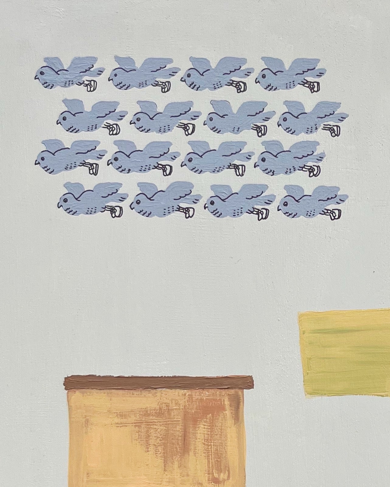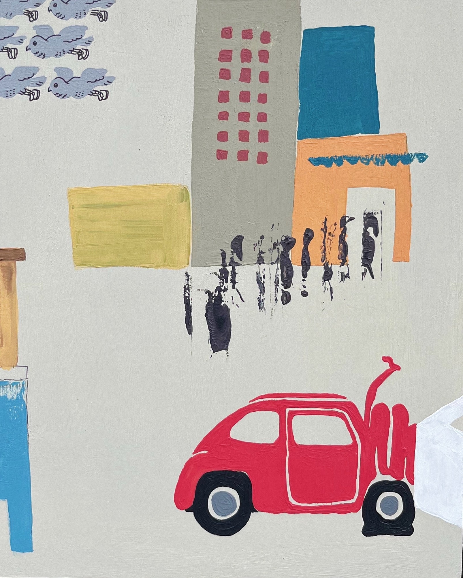 A car crashes into a stone wall in a park, a gang of pigeons stealing sneakers, a panicked shoe store and a line of people.