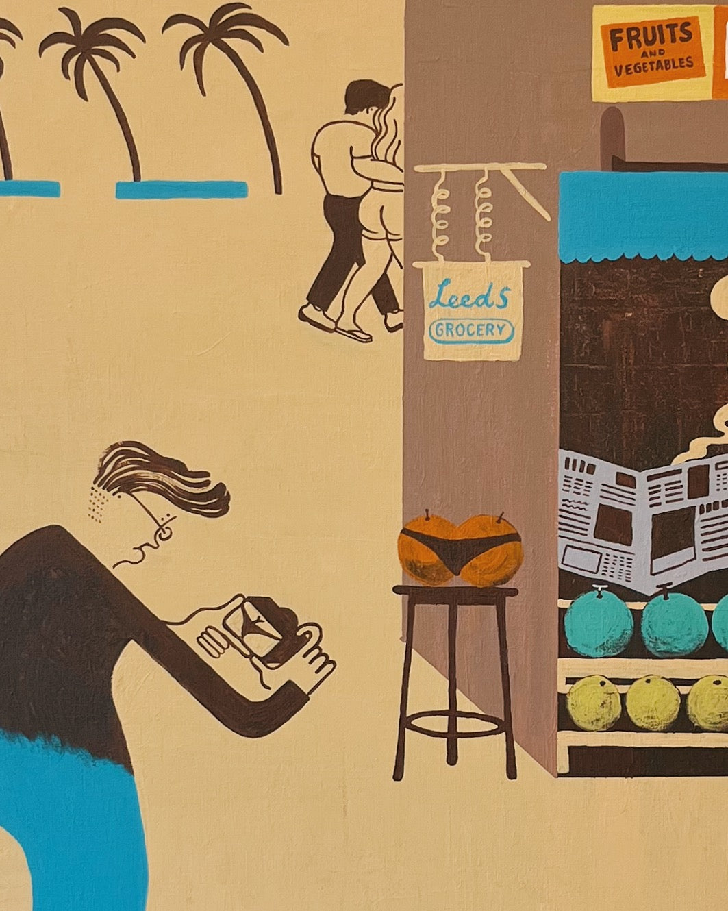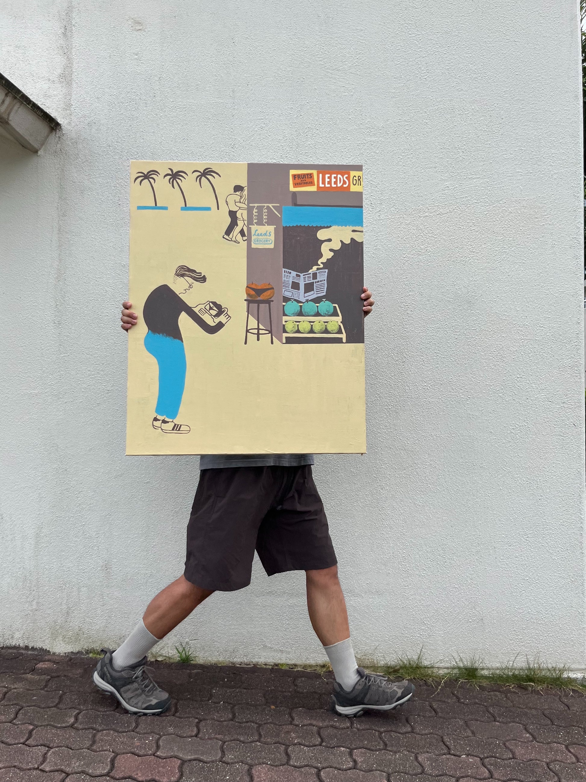This work is about the search for identity, with a motif of a boy who takes pictures of fruits as butts. He probably can't even talk to girls, so he tries to express himself and show his presence in a very roundabout way. But in the end, the man who just talks to women directly takes their real butts. The background, with colors like those of the American West Coast, is drawn in contrast to the gloomy boy, further highlighting his lack of a place in this city. The boy is modeled after the British band "The Smiths," which had cult popularity among the socially disadvantaged and sexual minorities in the 1980s, and their fans. In the lyrics of their song "Half a person /The Smiths (1987)," which was the inspiration for this painting, the protagonist monologues about chasing the tail of a person other than his lover for many years, but the gender of the person is not revealed (it is rather hinted that it is the same sex). Inspired by this song, this work depicts the uncertainty and search for one's place in the city, one's relationships, sexual preferences, and all aspects of one's identity.