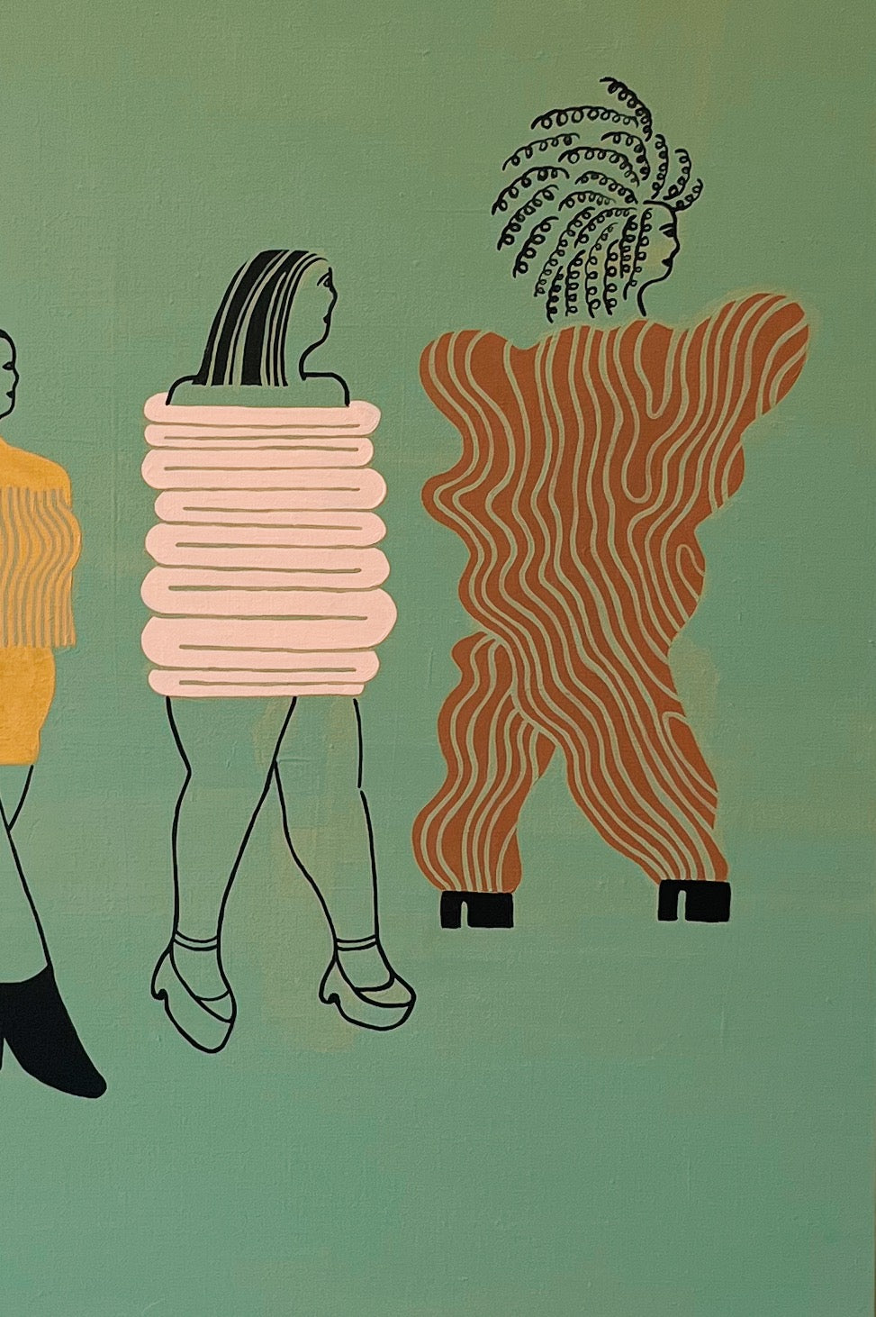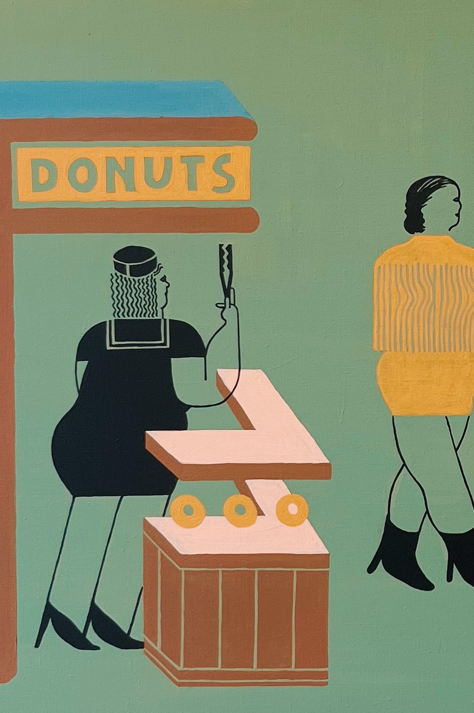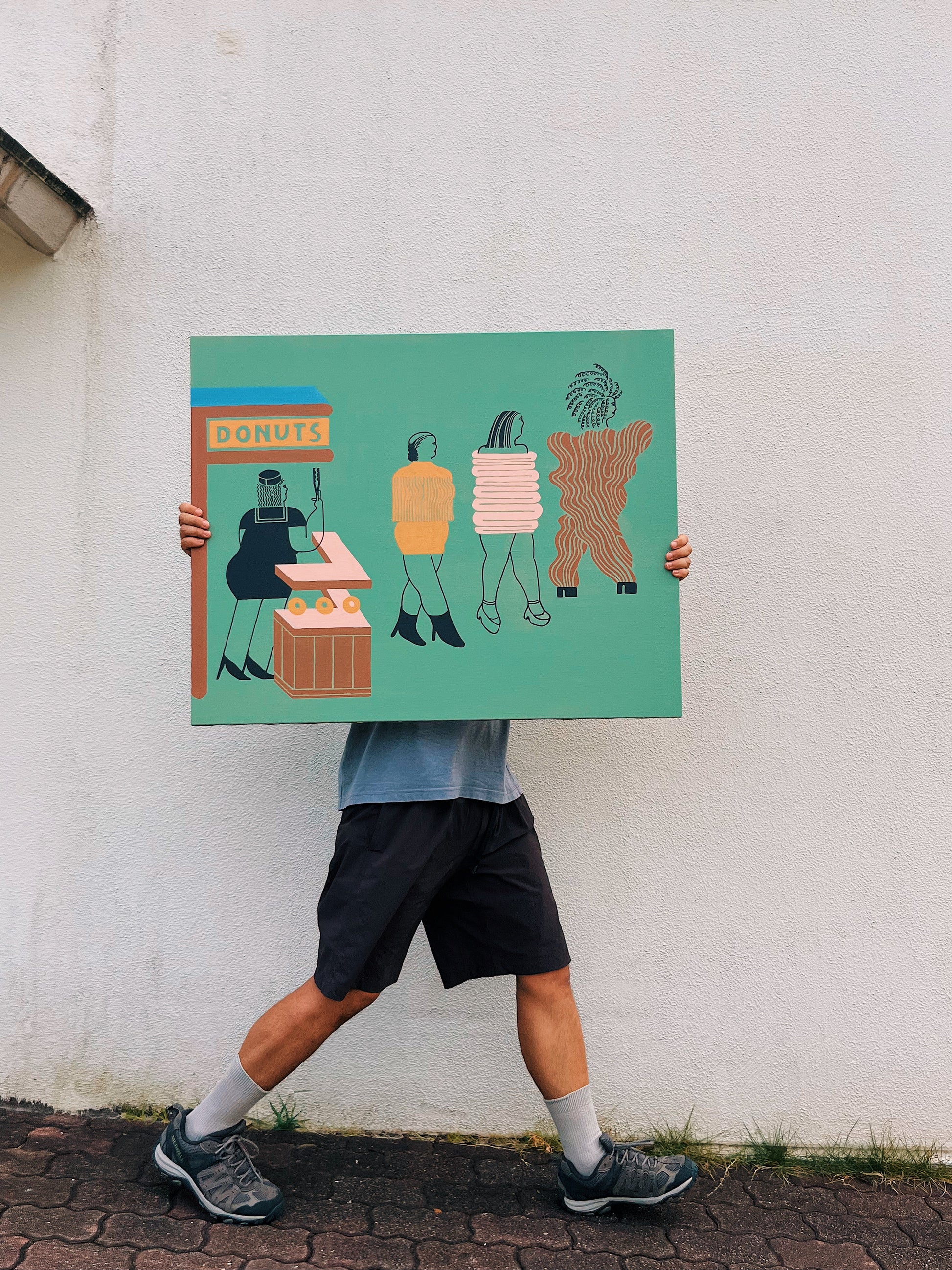 新たな世界へ行こうとする3人の女と、餞別の言葉とともに中指を立てるドーナツ屋の女。次に行く世界への憧れが表現された煌びやかな服は、まだ身体に馴染んではいない様子です。4人の間に何が起きたのかは描かれていません。むしろ何ひとつ起きなかったのかもしれません。しかしドーナツの穴のような、普段意識されることはないが心の中に確実に存在している(してした)欠落によって、人々は別れ、違う世界に進んでいくという瞬間を描きました。